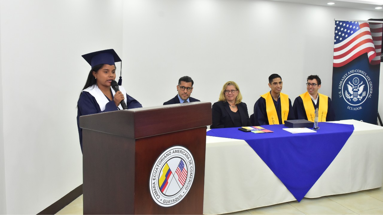 We hosted two graduation ceremonies—one in Guayaquil and another in Quito. Representatives from the U.S. Embassy and Consulate in Ecuador joined us to congratulate the graduates. Ana Taipe, a mathematics major from Escuela Politécnica Nacional, and Jhanelly Chalá, an economics major from Universidad Estatal de Milagro, were recognized as the program’s top graduates.