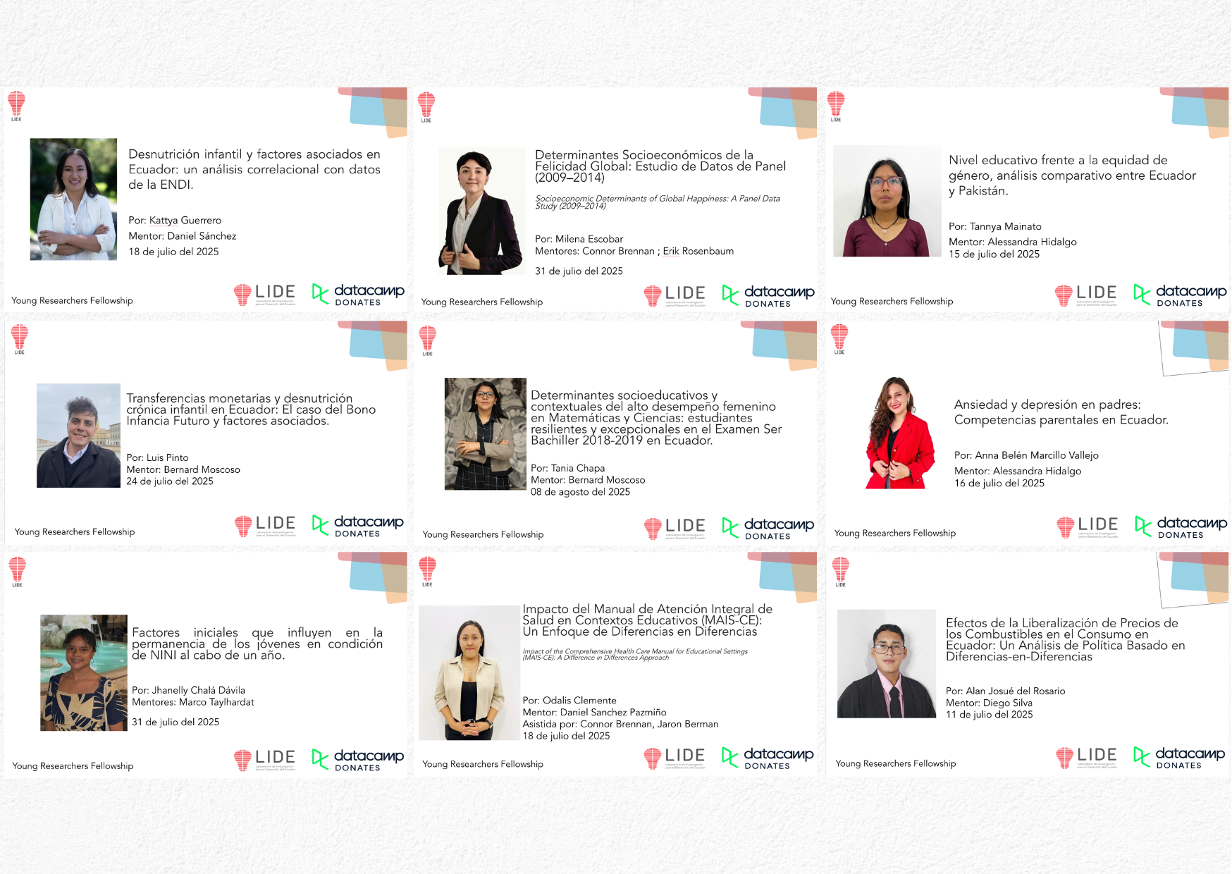 Con ese objetivo nació Young Researchers Fellowship, una iniciativa del Laboratorio de Investigación para el Desarrollo del Ecuador (LIDE) orientada a formar a la próxima generación de científicos sociales del país. El programa ofrece capacitación integral en investigación cuantitativa, análisis de políticas públicas, inglés académico y desarrollo de proyectos, junto con mentorías personalizadas y acceso a redes académicas. Estuvo pensado para estudiantes y graduados recientes de universidades ecuatorianas, con especial prioridad para jóvenes de bajos ingresos y de comunidades subrepresentadas en la academia. En su primera edición, reunió a becarios de todo el país en un formato remoto de ocho meses.